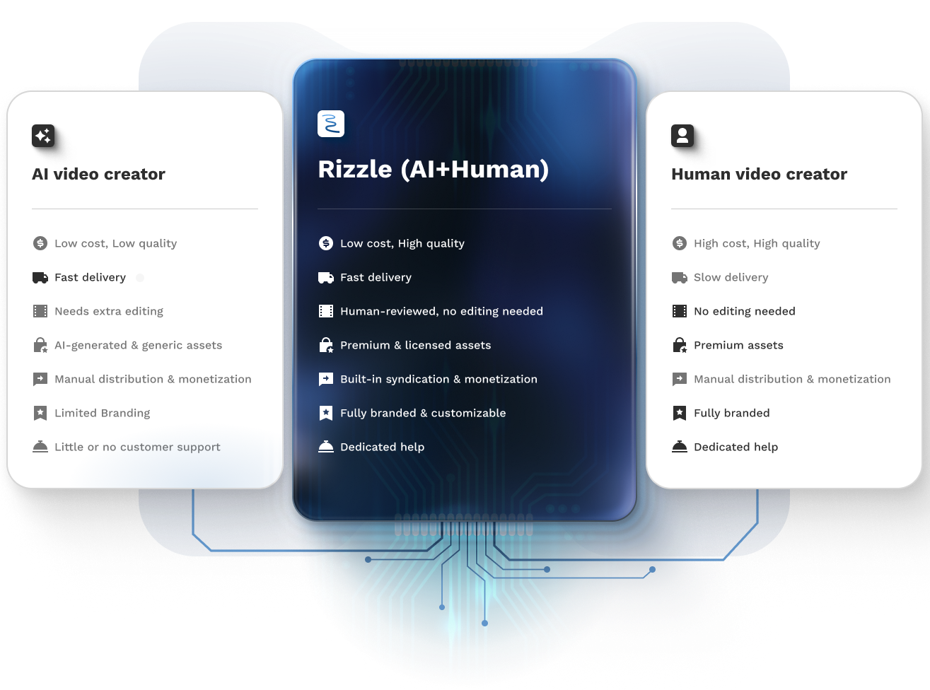 Our AI drafts your video instantly. Rizzle editors review every frame—so your content feels polished, not robotic.